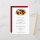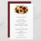 Menu de casamento Floral de girassol com um buquê rústico com girassol pintado com cor d'água, rosas vermelhas, flores roxas e verde. Este menu elegante é um excelente para um casamento outono com tema "boho". Esses menus baratos de casamento são impressos em folhas de papel para uma opção econômica.