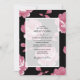 Este design apresenta rosas rosa elegantes. Apresentando fundo preto em combinação com as flores cor-de-rosa. Camada branca opaca, borda branca e texto simples criam uma aparência elegante e sofisticada. O elegante layout floral arranjado de um lado e o lado negro oposto exibindo os nomes da noiva e do noivo e um solteiro de rosa combinam-se para unir um design verdadeiramente único. Esta design é ideal para qualquer tema de casamento. O design perfeito para todas as estações. Também estão disponíveis itens de papelaria de casamento e outros formatos de convite de casamento.