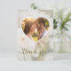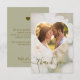 Expresse sua gratidão com elegância usando este cartão de agradecimento romântico com uma foto de uma rosa branca sonhadora de Destei, desbotada com uma sobreposição branca para um visual atemporal. A frente inclui uma moldura de foto em forma de coração onde você pode adicionar uma foto personalizada do casal, junto com “obrigado” em escrita graciosa. A parte traseira apresenta uma cor de fundo verde sage suave com uma silhueta de coração sutil, espaço para sua mensagem de agradecimento e despedida personalizada com nomes. Uma maneira sincera e elegante de agradecer aos seus convidados.