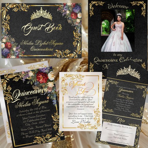 Floral & Gold Leaves - Black & Pearl QuinceneraCriado por Beth Harsh