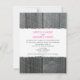 Um convite de casamento com uma foto na frente de um buquê de rosas cor-de-rosa e verde embrulhado com fio de burlap. Buquê repousa na alça de uma porta de celeiro. Personalize o lado oposto com detalhes da sua ocasião.