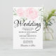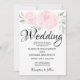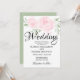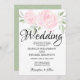 As rosas cor-de-rosa pinceladas suaves cercadas por folhas verdes sagistas quase se fundem no fundo branco. O casamento é escrito em um grande roteiro, com os detalhes do casamento abaixo. O verso do convite é um verde macio com uma sugestão de um padrão de folha.