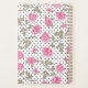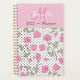 Planeador espiral impresso com rosas cor-de-rosa brilhantes e um padrão de bolinhas pretas num fundo branco na parte inferior. A parte superior é cor-de-rosa sólido e é separada por uma cadeia de pérolas. Há um lugar para você adicionar seu nome e inicial e o ano ao cobrir. A parte de trás é o padrão de rosas e bolinhas.