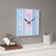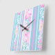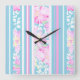 Um Relógio de Parede Praça bonito, com um padrão de Turquesa e Tiras de Cadeira Branca e Rosas Rosa na Turquesa, pontilhado com pequenas Borboletas Brancas: parte da coleção Posh & Painterly 'Summer Days'.