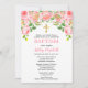 Elegante cor d'água rosa vibrantemente rosa rosa rosa rosa, menina floral design de convite Baptism apresentando flores em um buquê tipo "top swag" ao redor dos detalhes de seu doce bebê. Uma cruz de tom dourado fica abaixo do padrão floral, e a parte de trás apresenta um fundo cor-de-rosa marcado. Este design floral composto é feito por Designs Holiday Hearts (direitos reservados).