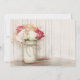 Rustic Country Pintou Mason Jar com rosas Convites para Casamento com fundo de madeira de celeiro e o pote de pedreiro sentado numa caixa de madeira rústica. O jarro de mason também tem um arco gêmeo amarrado ao redor. O design é um design de pintura apressado e rústico com fundo de madeira de celeiro. Este convite de casamento é excelente de convites para casamento no país usando jarras de pedras e madeira rústica em sua decoração de casamento. O jarro de mason é pintado com uma cor creme e os rosas são vários tons de rosa claro, creme, laranja e rosa quente.
