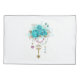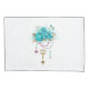 Chave de ouro antiga com rosas de turquesa de tendência, decoradas com folhas de ouro branco e miçangas cor-de-rosa e azuis. Cor agradável. Rosas de turquesa. Ouro branco. Tifania azul.