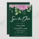 Rosas cor-de-água verde-escura cor-de-rosa com letra branca, escrita à mão, personalizável convite "Salvar a Data". Este design apresenta belas rosas cor-de-rosa e uma grande fonte de estilo caligráfico que você pode mudar para qualquer outra cor que quiser. Você também pode personalizar todos os detalhes e cores de texto neste modelo Salvar Data.