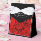Esta caixa de favoritos do casamento é mostrada a preto com um arco de fita branco e uma impressão rosa vermelha na frente. Mostrado com nomes de exemplo e data. Personalize este item e altere os nomes e a data para o seu.