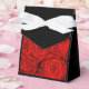 Caixa de favoritos do partido mostrada a preto com um arco de fita branco e com rosas vermelhas na frente. Personalize este item ou comprar como está.
