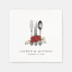 Um belo guardanapo de casamentos com rosas vermelhas de aquarelas/florais e design de verde com talheres de safra. Fácil de alterar ou excluir os campos de texto para atender às suas necessidades pessoais. Perfeito para casamentos de verão, chás, jantas de ensaio e comemorações! Coisas nesta coleção encantadora.