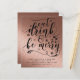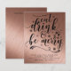 Cartão atraente moderno de Natal ou outros feriados com tipografia que diz 'Coma, Beba e Alegre-se' e fundo com aparência metálica em rose gold. Campos de modelo de texto em ambos os lados garantem que você possa escrever sua carta anual para amigos e familiares. Envelopes não incluídos.