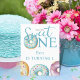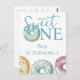 Um primeiro aniversario para marcar o primeiro aniversário do seu filho. O convite é um tema de sobremesa com uma rosquinha/rosca de cor-de-água delgada. A mensagem diz "Doce" em conformidade com o convite para o tema da sobremesa. Este convite pode ser personalizado com a inclusão dos detalhes do seu pequeno partido. A design é bonita, moderna e doce.