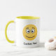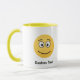 Um rosto sorridente, com olhos abertos. Texto personalizado de ambos os lados.