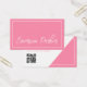 Cartões de visitas de perfil do influenciador com seu nome na frente em uma fonte de script manuscrita de tendência. Adicione o identificador de mídia social e o site na parte traseira e personalize o código QR. Design cor-de-rosa e branca. As cores podem ser personalizadas com a ferramenta design.
