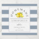 Limões e folhas de aquarela, etiqueta de bebida de limoncelo moderna. Recursos de etiquetas, padrão de faixa branca e azul empoeirado.