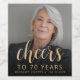 Esta etiqueta personalizada de 70 de aniversário apresenta a foto personalizada, o nome e o aniversário do convidado de honra, juntamente com a palavra "Saúde" em um elegante roteiro de caligrafia dourada. Uma tela escura ajuda a tornar o texto pop. Uma forma excelente de celebrar alguém que faz setenta anos!