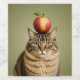 Gato engraçado com uma maçã balançando em cima de sua cabeça.