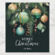 Etiquetas elegantes para garrafa de vinho de Natal com ramos de pinheiro, ornamentos de bolas de Natal verdes e dourados e fitas em fundo preto com seus detalhes em letra sofisticada, perfeito para sua reunião festiva de Natal ou para dar de presente.