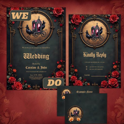 Carruagem gótica com Ravens e Rosas. Uma carruagem no estilo gótico sendo puxada por dois corvos vestindo chapéus superiores, definida dentro de um ornamentado, ouro circular. A carruagem é decorada com flores e tem uma cruz no topo. O fundo é um verde escuro, texturizado, e o quadro é rodeado por rosas vermelhas e ouros decorativos floresce. O humor geral é escuro, elegante e levemente caprichoso.