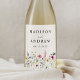 Etiquetas de vinho floral legantes que apresentam uma borda inferior de flores silvestres e folhagem de cor d'água em tons de rosa, amarelo, roxo, azul e verde em fundo creme. Personalize as etiquetas de vinho de flor silvestre com seus nomes e data de casamento. As etiquetas personalizadas de vinho de flor silvestre são perfeitas para chás, festas de noivado, jantadas de ensaio e recepções de casamento. Projetado para coordenar com a nossa coleção de casamentos de Wildflower Meadow.