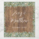 Personalize as garrafas de vinho do seu casamento com esta etiqueta de vinho botânica que apresenta folhagem de eucalipto, flores brancas, acentos dourados e textura de madeira rústica. Perfeito para lembranças de casamento, jantares de ensaio ou mesas de recepção.