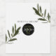 Esta design apresenta folhas e ramos de oliveira. O belo verde das folhas elogia a elegante forma negra e moderna do círculo ao redor da data do casamento. Uma fusão perfeita do moderno e chic com cores rústicas da azeitona. Verde-oliva, preto e branco são uma combinação perfeita para um casamento temático mediterrânico. Design de etiqueta de vinho de casamento única com elementos modernos. Os convites de casamento e outros artigos de papelaria também estão disponíveis.