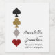 Estas etiquetas de garrafa de vinho personalizadas apresentam um tema do casino de Las Vegas. Os quatro naipes num pavimento de fios são impressos à esquerda num padrão horizontal. A pá é um design preto, o clube é ouro, o diamante é prata, e o coração é um design vermelho-brilhante. Os nomes do casal e da data do casamento da amostra são impressos à direita em uma fonte preta elegante.