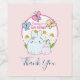 Obrigado por etiquetas de garrafas para um evento. Um quadro circular branco com uma borda cor-de-rosa colocada sobre cima com seu dentro de texto personalizado. Dentro na moldura uma ilustração de uma mãe e um coelhinho de bebê juntos. Águas amarelas no fundo. Borboletas brancas se espalhando.