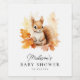 Etiquetas de vinho de chá de fraldas, cômodas, com tema florestal, com uma ilustração aquosa de um esquilo bebê cercado por folhas de outono em tons de laranja, vermelho e amarelo. Personalize as etiquetas de vinho de chá de fraldas de esquilo para bebês com o nome da futura mãe e a data do chá de fraldas. Projetado para coordenar com a nossa coleção de Chás de fraldas de Animais da Floresta em Cuta.