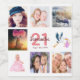 Uma etiqueta para uma festa de aniversário de 21 anos, celebrando sua vida com uma colagem de 8 fotos suas. Modelos para um nome, 21 anos e uma data. Data de nascimento ou data da festa. Coral e letras coloridas burladas. Fundo branco.