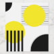 Ilustração abstrata com formas geométricas (círculos e listras) formam decoração em cores amarela e preta sobre fundo branco.