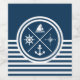 Design náutica com símbolos náuticos (âncora, barco à vela, roda à vela, bússola) decoração em fundo listrado branco e azul marinho.
