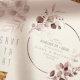 Arranjos delicados, folhagem com pequenos sotaques florais em tons suaves e sonhosos de creme, esticados e rosa com salpicos de burgundy e layouts únicos de design, fazem disso uma coleção excitante, especialmente para casamentos de outono.A etiqueta de vinho de casamento mostrada aqui apresenta folhagem exuberante em torno de um quadro dourado em forma de diamante. Adicione sua mensagem pessoal, nomes e data de casamento usando o modelo fornecido. Veja o link de coleção nesta página para ver todos os itens correspondentes neste belo design ou ID817 de pesquisa para ver outras peças e opções de cor para este conjunto.