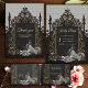 Elegância em prata e preto. Esta imagem mostra uma ilustração em preto e branco de uma estrutura de casamento com ouro intrincado e embelezamentos de prata. O quadro é adornado com padrões florais de ornamentado e um arco central. Uma noiva de vestido, segurando um buquê, fica dentro do quadro, virada para longe do espectador. O fundo é uma superfície preta texturizada, criando uma atmosfera dramática e elegante.