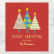 Uma simples, moderna e vermelha marca de vinho Feliz Natal para presentes familiares e amigos, com pinheiros coloridos e caligrafia de tendências.