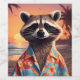Engraçado Raccoon vestindo uma camisa havaiana em uma bela praia.