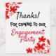 Flores vermelhas ilustradas com texto lendo: "Obrigados por vir à nossa festa de noivado" Sirva aos seus amigos e familiares uma garrafa pessoal de sua bebida favorita!