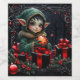 Filha de Elfo Bela em Casaco verde com Enfeites de natal - Design de Férias de Fantasia Mágica. Uma criança bonita de elfo com olhos grandes e ouvidos pontiagudos veste um casaco de capuz verde aparado e segura um Enfeites de natal laranja brilhante. Cercado por caixas de presentes com fitas vermelhas, ramos de pinheiros e bagas, esta cena mágica de feriado parece festiva e mística. A sombria estrutura de ornamentado com vista para uma floresta encantada torna este design perfeito para amantes da fantasia, fãs de Natal e arte mágica de férias.