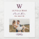 A rústica garrafa de vinho de casinha apresenta um monograma casado dos nomes da noiva e noiva e do sobrenome inicial, data do casamento e tipo de vinho, combinado com uma foto da noiva e do noivo. Fundo de marfim com texto vermelho escuro / roxo.