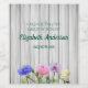 Garden party graduation with pink and white roses as well as blue and purple wildflowers.