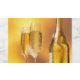 Dois copos espumantes de champanhe ao lado de uma garrafa refrigerada, cercada por gelo macio.