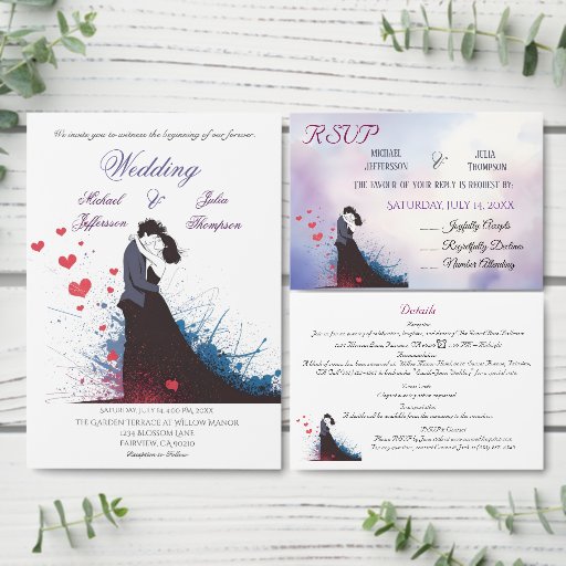 Essa elegante e artística design combina o romance com uma design moderna e expressiva. A peça central é uma silhueta de um casal que abraça apaixonadamente, simbolizando amor e unidade. O trabalho de arte apresenta um efeito de abertura criativo em tons de azul profundo, vermelho e preto, acrescentando um toque contemporâneo e dinâmico. Corações dispersos aumentam o sentimento romântico, enquanto a fonte na moda caligráfica proporciona uma elegância eterno. O layout é limpo, mas expressivo, fazer perfeito para casais que querem um tema único, ligeiramente não convencional e de casamento artístico. A imagem combina a sofisticação tradicional com uma estética moderna, nova, fazer adequada para casamentos criativos, boêmicos ou românticos.