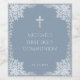 Este elegante desenho religioso em azul e prata com ar vintage, recomendado para a primeira comunhão de um menino, tem uma moldura ornamentada em folha de prata falsa com galhos intrincados com folhas em um fundo azul empoeirado. Acima do texto há uma cruz religiosa, também em folha de prata falsa. O texto tem uma cor cinza prateado semelhante à moldura de prata falsa.