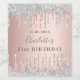Para uma festa de aniversário de 21 anos brilhante e glamourosa. Um fundo metálico falso de rosa dourado com rosa dourado, cor-de-rosa e bobinadeiras falsas, aparência de pingar tinta. Personalize e adicione uma data, nome e idade 21. O nome é escrito em cinzas escuras com um moderno estilo escrito à mão.