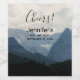Etiquetas de aniversário ou outras garrafas de evento com uma fotografia de belas montanhas, céu nublado e colinas rolantes cheias de árvores em primeiro plano. esquema de cor azul da cinza.