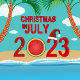 A ilustração do Natal de julho de 2023, com o número vermelho do ano 2023, decorado com corrente luminosa colorida, melancia fatiada e chapéu vermelho de Papai Noel. Exibido na praia com palmeiras e água oceânica.