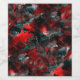 Desenho grosseiro de arte gráfica onde o vermelho sofre um leve gradiente causando uma percepção de algo retorcido, especialmente quando contrasta com o cinza branco e outras partes chocam com manchas pretas causando uma percepção que lembra sombra, parecendo assim que partes da 'folha vermelha' estão flutuando ou a uma distância do chão.