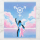 Silhuetas femininas estão sob um céu de algodão doce com um símbolo transgênero branco no céu como o sinal de morcego, ele tem um coração no meio.
