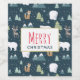 Etiquetas com um padrão festivo caprichoso. Ursos polares, renas, árvores, raposas e flocos de neve. Num fundo verde escuro. Um quadro retangular com uma borda falsa de folha de ouro com dentro de Feliz Natal.
